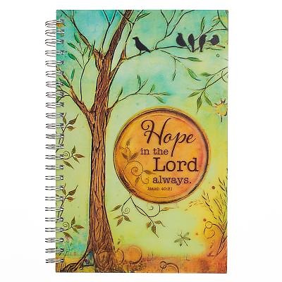 his "Hope in the Lord always" Wirebound flexcover notebook features text from Isaiah 40:31, birds and a tree on the cover. The cover is printed on durable PVC. It is 5.25" x 8.5" and features 128 lined pages with scripture.