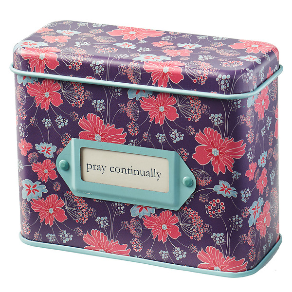 The powerful gift of prayer is available to Gods children at all times. The lively looking Pray Continually cards are part of the Prayer Cards in Tins collection. This beautiful tin welcomes women to the fifty double-sided prayer cards inside, offering a host of prayers from saints of the past. The authors of these prayers are brothers and sisters in the Christian faith, some coming from Scripture, like the Lord Jesus himself or the prophets, while others come from faithful Christians throughout the centuries. This deep purple floral printed tin would make a great graduation gift for any woman to inspire her delight in the discipline of prayer. Pink and blue modern flowers sweetly embellish the deep purple exterior of the durable matte tin, while the inside and edging sport a light blue finish. A blue metal label on the front of the tin carries a removable tab printed with the reminder to pray continually. Inside are fifty double-sided cards, each with a theme titled prayer on one side, and a lined space to write out your own prayers. Tin Size: 5 (W) x 2 (D) x 4 (H) Card Size: 4 3/8 (W) x 3 (H) 50 Double Sided Cards Matte Tin