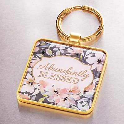 The Lord will love you and bless you Deuteronomy 7:13 This charming keyring displays the sweet sentiment of the Lords love for us and the abundant blessings he pours out daily. The title of the keyring, Abundantly Blessed, is stated on the front of the keyring surrounded by a beautiful bouquet of flowers. The reverse side has a pale salmon background with the Scripture verses from Deuteronomy 7:13. Both front and back are epoxy filled with a gold trim. The split metal ring can be used to securely fasten keys, charms, ID cards or a mini flashlight.