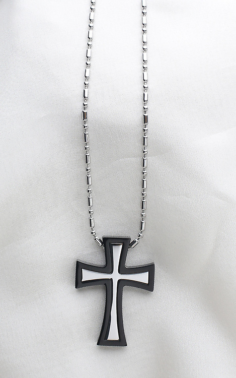 This cross in cross design can be worn together or separately. Made of black powder coated stainless steel this pendant makes a striking statement of faith.