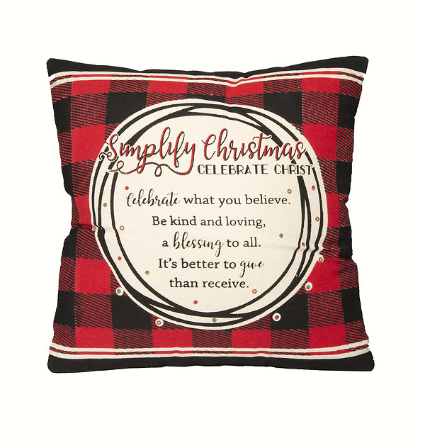 This Red, white and black checked pillow helps us to Simplify Christmas - Celebrate Christ by the gentle reminder printed on the front. Has a button back for easy washing. Measures 12" x 12".