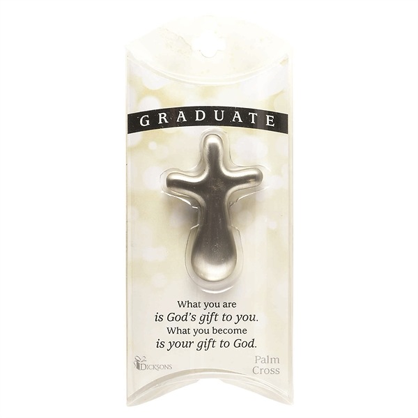 Graduate, What You Are Is God's Gift Palm Cross, unique curved cross is an excellent prayer tool; fits nicely into palm and is easy to hold. Comes in clear box with header card that has these words: What you are is God's gift to you. What you become is your gift to God. Cross is zinc alloy metal with pewter tone finish. Size is 2 1/2 x 1 5/8 .