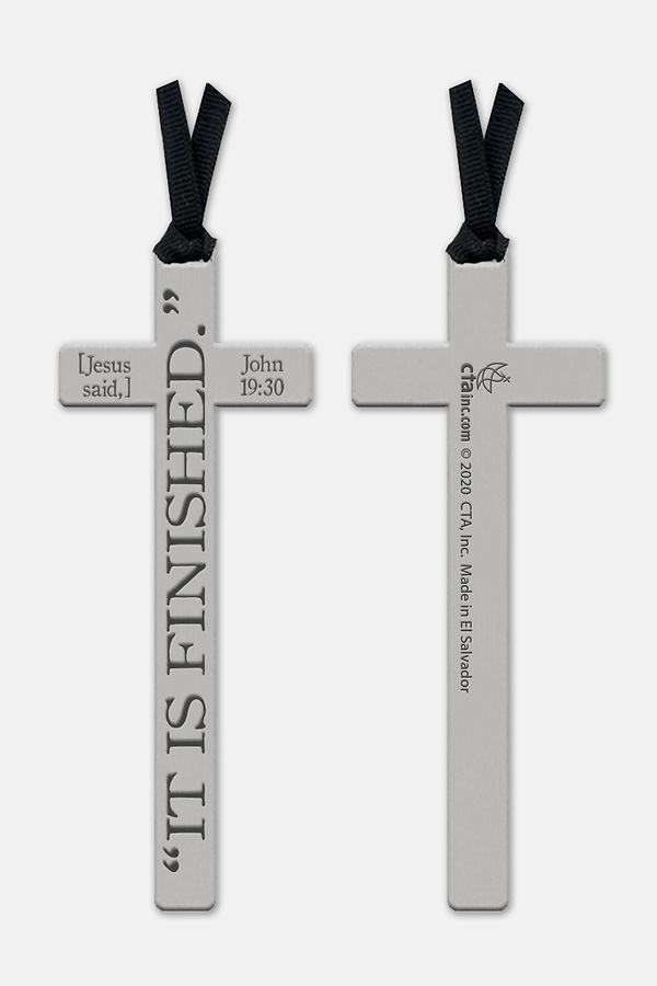 It if finished cross features the verse from John 19:30 quoted on the front and has a ribbon attached.