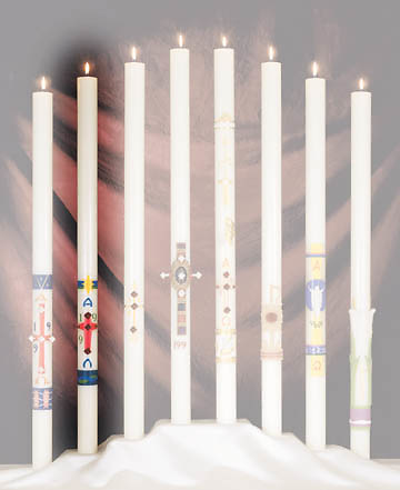 This 2" diameter x 39" long Dominican candle is exquisitely crafted of pure white 51% beeswax; marked with a cross, an Alpha and an Omega. The four numbers of the year are marked between the arms. Includes incense nails and year dates.