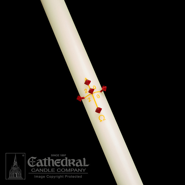 This 2" diameter x 36" long Plain Paschal candle is exquisitely crafted of 51% pure white beeswax; marked with a cross, an Alpha and an Omega—decal design may be easily peeled off. The four numbers of the year are marked between the arms. Includes incense nails and year dates.