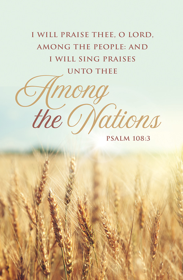 An attractive bulletin featuring a calming wheat field used for General occasions. Text: Among the Nations Scripture: “I will praise thee, O Lord, among the people: and I will sing praises unto thee among the nations.” Psalm 108:3 (KJV) The bulletin is shown folded (8.5" x 5.5"), exactly as church members and visitors will receive it. The back side is blank to include the information you choose. Bulletins arrive packaged flat 8.5" x 11" to fit into your printer or copier; shrink wrapped in packages of 100.