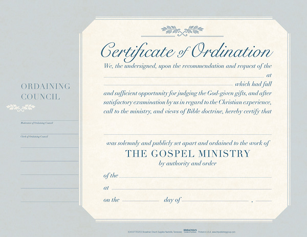 This flat Minister Ordination Certificate is printed on parchment look quality paper, with space to include Ordinaining Council, Church, Name and Address, Ordianee Name, and Date.