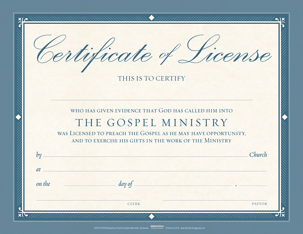This flat Minister License Certificate is printed on parchment look quality paper, with space to include Ordianee Name, Church, Name and Address, Date, Clerk and Pastor.