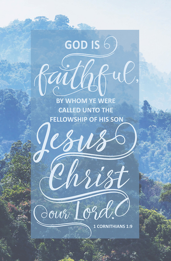 A well-dressed bulletin featuring a beautiful hilltop of trees used for General occasions. Scripture: “God is faithful, by whom ye were called unto the fellowship of his Son Jesus Christ our Lord.” Psalm 46:10 (KJV) The bulletin is shown folded (8.5" x 5.5"), exactly as church members and visitors will receive it. The back side is blank to include the information you choose. Bulletins arrive packaged flat 8.5" x 11" to fit into your printer or copier; shrink wrapped in packages of 100.