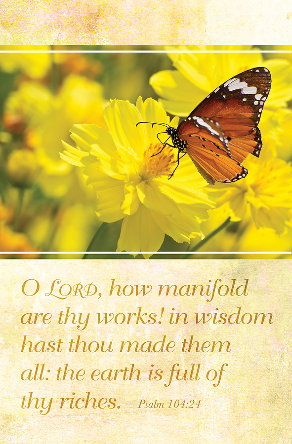 A general regular size bulletin featuring a butterfly on a flower. This bulletin can be used during general worship occasions. Text: "O Lord, how manifold are thy works! In wisdom hast thou made them all: the earth is full thy riches." Psalm 104:2 KJV.