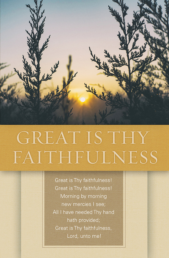 A general bulletin with a beautiful sunset going down over the trees. Text: Great Is Thy Faithfulness - " Great Is Thy Faithfulness! Great Is Thy Faithfulness! Morning by morning new mercies I see. All I have needed thy hand hath provided: Great is Thy faithfulness, Lord, unto me!