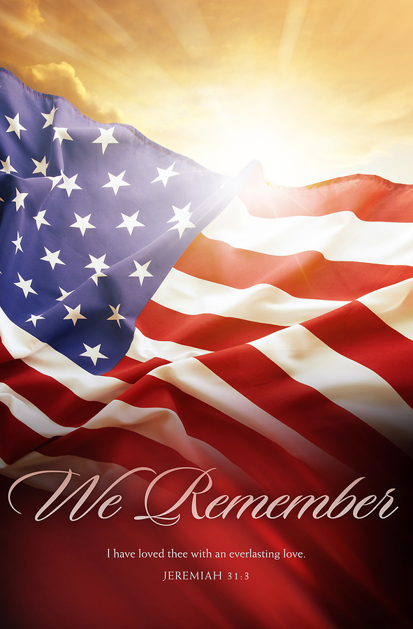 A vibrant bulletin featuring the American flag with a sunset. Text: "I have loved thee with an everlasting love." Jereimiah 31:3 KJV