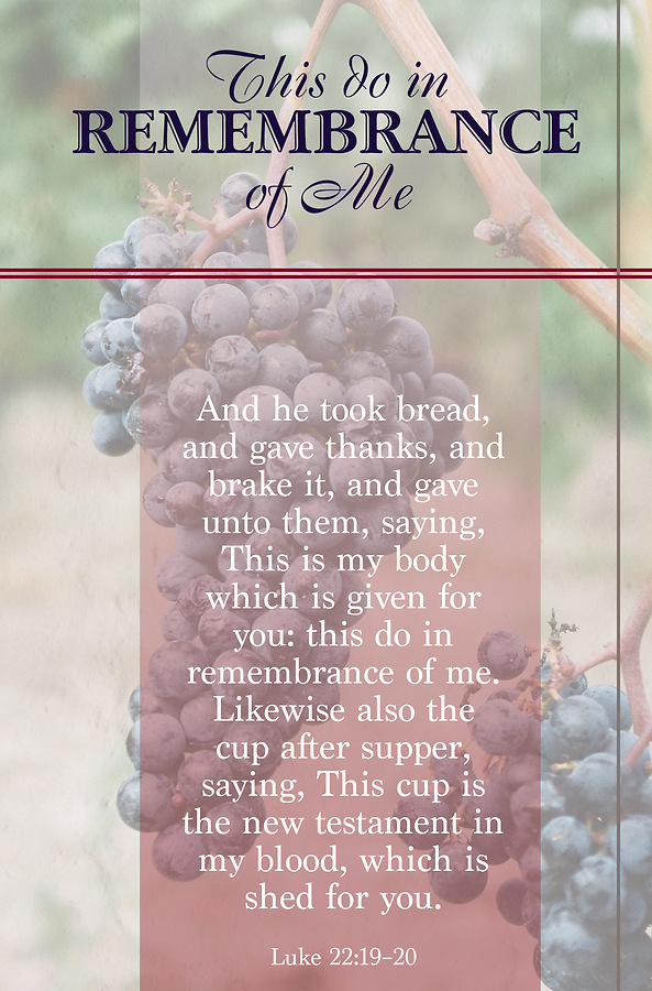 Scripture: “And he took bread, and gave thanks, and brake it, and gave unto them, saying, This is my body which is given for you: this do in remembrance of me. Likewise also the cup after supper, saying, This cup is the new testament in my blood, which is shed for you.” Luke 22:19-20 KJV. Size: 8.5" x 11" folds to 5.5" x 8.5"