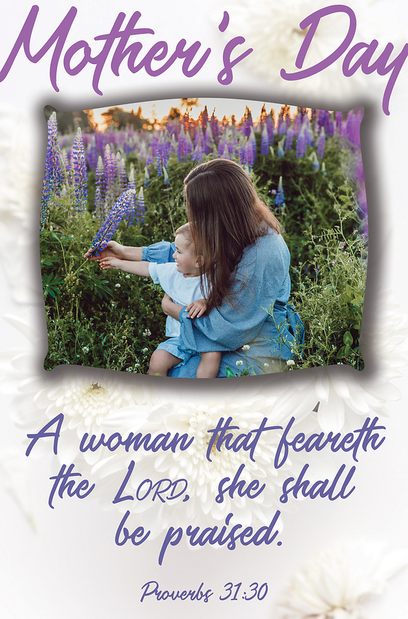 Text: Mother’s Day. Scripture: “A woman that feareth the Lord, she shall be praised.” Proverbs 31:30 KJV. Size: 8.5" x 11" folds to 5.5" x 8.5"