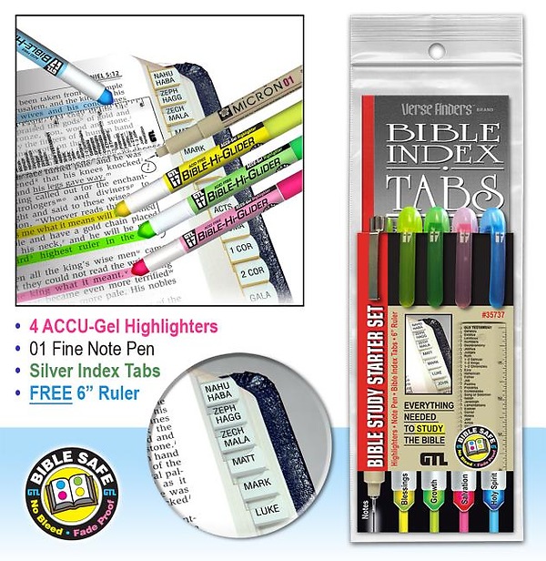Everything Needed to Start Studying the Bible. Includes Kid's Verse Finder Bible Index Tabs, 4 ACCU-Gel Bible-Hi-Gliders (Blue, Green, Pink, Yellow), One Black 01 Pigma Micron Bible Pen, Plus FREE Books of the Bible Ruler/Straight Edge/Bookmark. All at a Special Sale Price.