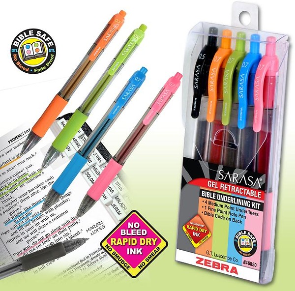 SET OF 5 - Evolutionary Rapid Dry Ink NO BLEED, NO SMEAR, NO SMUDGE!!! ZEBRA SARASA Retractable Gel Pens Are Ideal to Underline in Bibles. Kit Includes: 4 Bright Medium 0.7mm Underliners Blue, Green, Orange and Pink