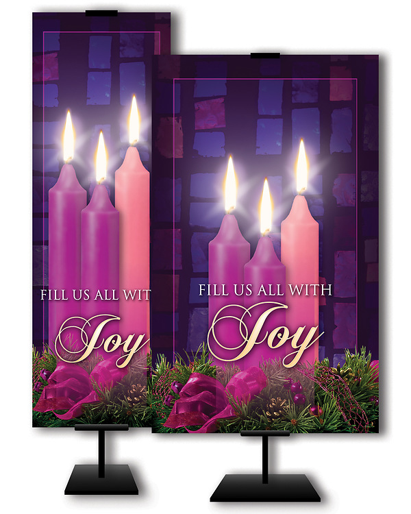 Advent Week 3 Banner displays 3 lit candle against stain glass window, surrounded by a Christmas wreath. Measures 3' x 5' . Made of fabric. (Banner stand sold separately)