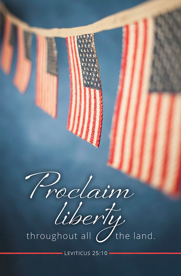 Celebrate freedom with this patriotic bulletin featuring Leviticus 25:10 and festive American flag bunting. The inspiring message "Proclaim liberty throughout all the land" connects biblical principles to national heritage.