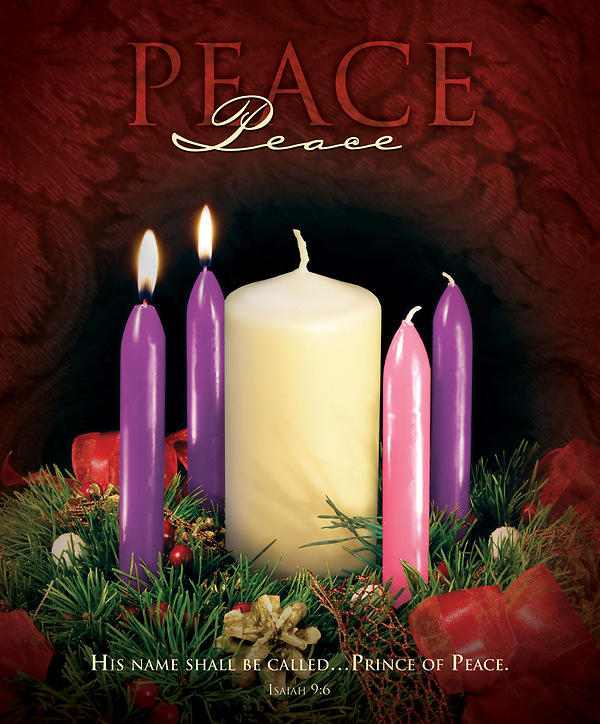 An elegant legal size week 2 Advent bulletin featuring traditional purple and pink candles, a Christ candle, and the title Peace. Text: Peace. “HIS NAME SHALL BE CALLED… PRINCE OF PEACE”. Scripture: Isaiah 9:6 (KJV)