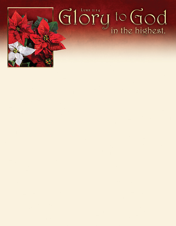 Send Christmas greetings on Glory to God Poinsettia (Luke 2:14) Letterhead featuring red and white poinsettias and the Scripture verse: Glory to God in the highest. Luke 2:14.