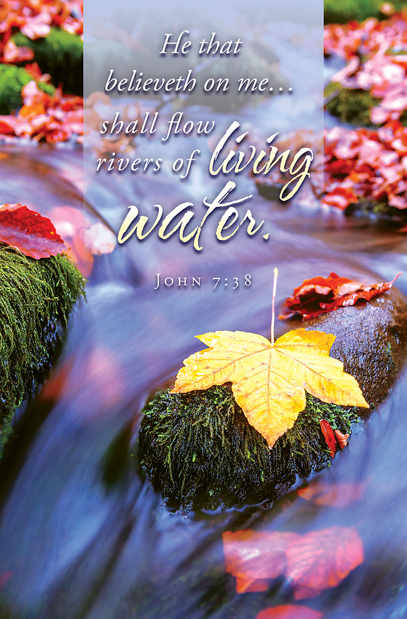 A beautiful regular size bulletin featuring an open spring with fall colored leaves. This bulletin can be used during General occasions. Text: He that believeth on me...shall flow rivers of living water. John 7:38 (KJV) Scripture: “He that believeth on me, as the scripture hath said, out of his belly shall flow rivers of living water.” John 7:38 (KJV).