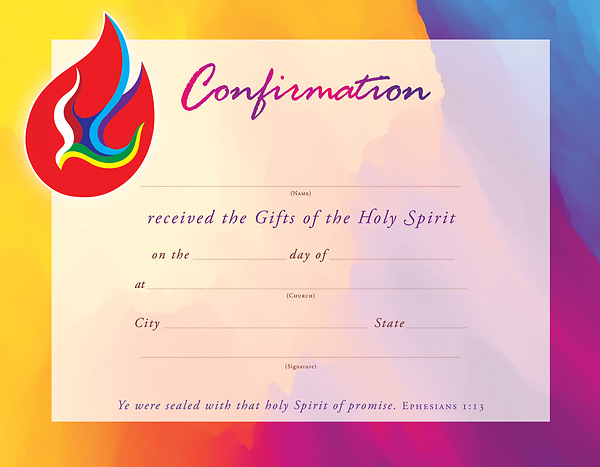 Confirmation Dove (Ephesians 1:13, KJV) Certificates feature a dove inside a tongue of fire. A lovely way to celebrate this special day in an individual's life of faith. 8.5" x 11". Sized for framing.