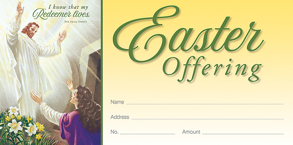 Offering Envelope featuring traditional artwork of Jesus and Mary at the tomb after the resurrection. (Pkg of 100) 6.25"x 3.125" Text: I know that my Redeemer lives. Job 19:25 (NKJV) Easter Offering