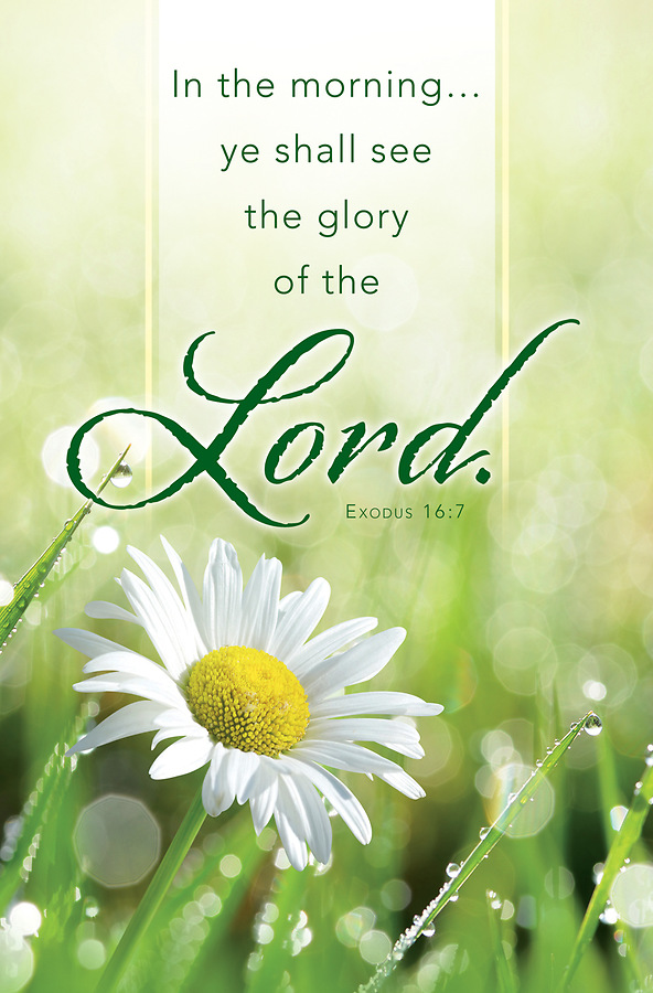 A graceful regular size bulletin featuring a beautiful white daisy. This bulletin can be used during general worship occasions. Text: In the morning… ye shall see the glory of the Lord. Exodus 16:7 (KJV). The bulletin is shown folded (8.5" x 5.5"), exactly as church members and visitors will receive it. The back side is blank to include the information you choose. Bulletins arrive packaged flat 8.5" x 11" to fit into your printer or copier; shrink wrapped in packages of 100.