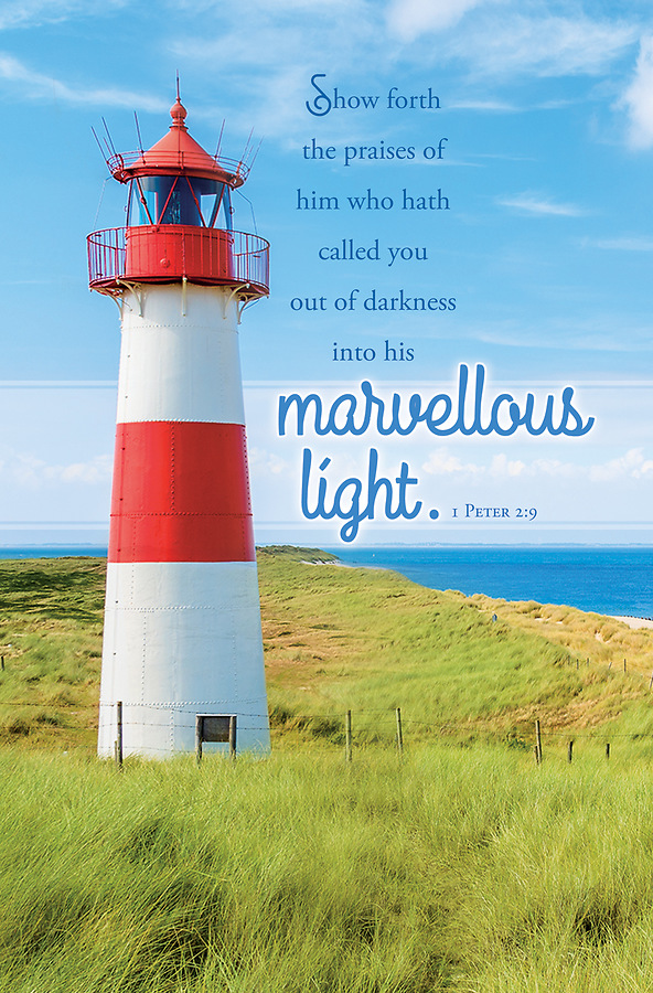 An attractive regular size bulletin featuring a red and white lighthouse. This bulletin can be used during general worship occasions. Text: Show forth the praises of him who hath called you out of darkness into his marvelous light. 1 Peter 2:9 (KJV). The bulletin is shown folded (8.5" x 5.5"), exactly as church members and visitors will receive it. The back side is blank to include the information you choose. Bulletins arrive packaged flat 8.5" x 11" to fit into your printer or copier; shrink wrapped in packages of 100.