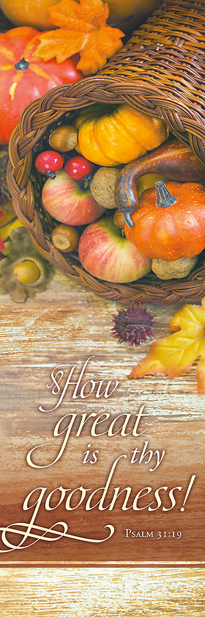 This seasonal banner encourages praise to God as we remember, How great is thy goodness! (Psalm 31:19, KJV). The cover image features a cornucopia filled with vibrant autumn produce.Size: 3' x 5'. Mounts to a T-style banner stand via pole pockets at the top of the banner. Satin Fabric