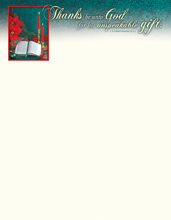 Share the good news of Christmas with this letterhead and the displayed passage, Thanks be unto God for his unspeakable gift (2 Corinthians 9:15, KJV). The traditional image in the left-hand corner shows an open Bible surrounded by winter greenery, berries, ribbon, glowing red candles, and a red poinsettia. Size: 8.5" x 11"