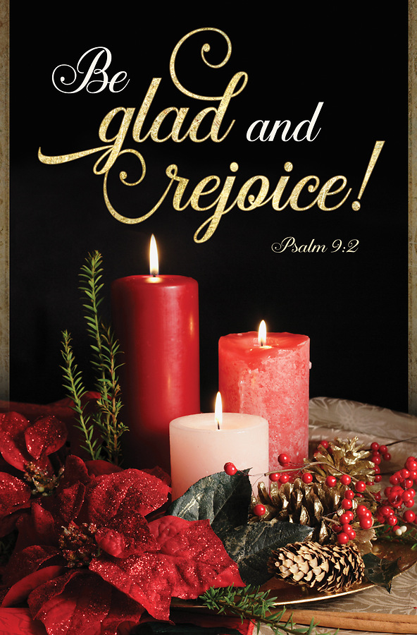 Celebrate the gift of Jesus with this standard Christmas bulletin and the displayed passage, Be glad and rejoice! (Psalm 9:2, KJV). The image is dressed in warm colors and consists of Christmas florals surrounding three pillar candles. 8.5" x 11" folds to 5.5" x 8.5"
