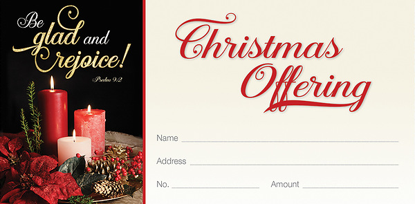 Help recipients celebrate the gift of Jesus through their tithes and offerings with this Christmas Offering envelope. and the displayed passage, The image on the offering envelope is dressed in warm colors and consists of Christmas florals surrounding three pillar candles. Psalm 9:2 (KJV) reads, Be glad and rejoice!