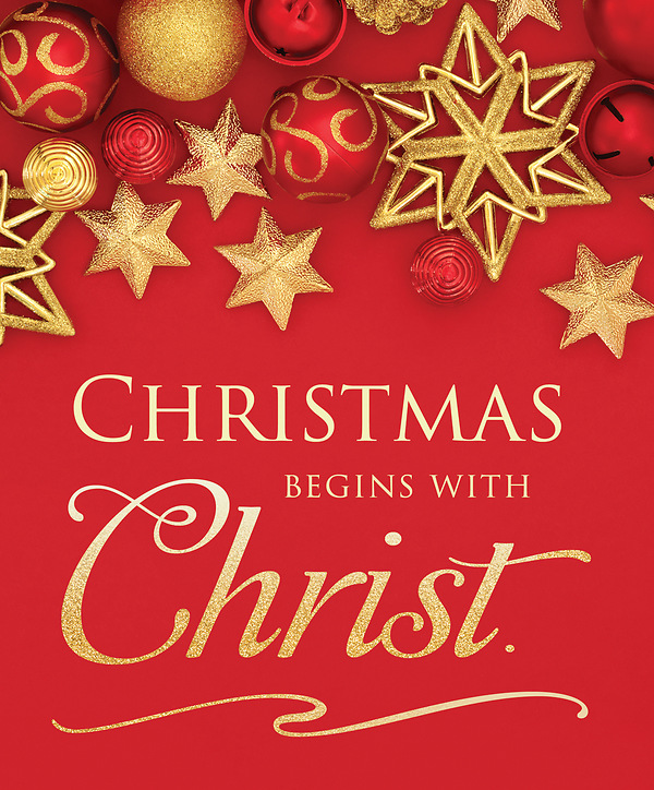 Remind your congregation of the timeless truth that "Christmas begins with Christ." This legal bulletin features these words typeset in gold letters against a bright red background and surrounded by gold and red Christmas decorations. Size: 8.5" x 14" folds to 7" x 8.5"