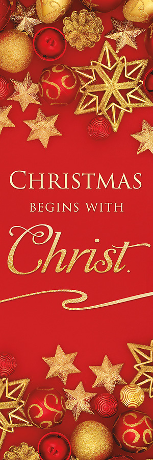 Remind your congregation of the timeless truth that "Christmas begins with Christ." This beautiful banner features these words typeset in gold letters against a bright red background and surrounded by gold and red Christmas decorations. Size 2’ x 6’ Mounts to a T-style banner stand via pole pockets at the top of the banner. Satin Fabric