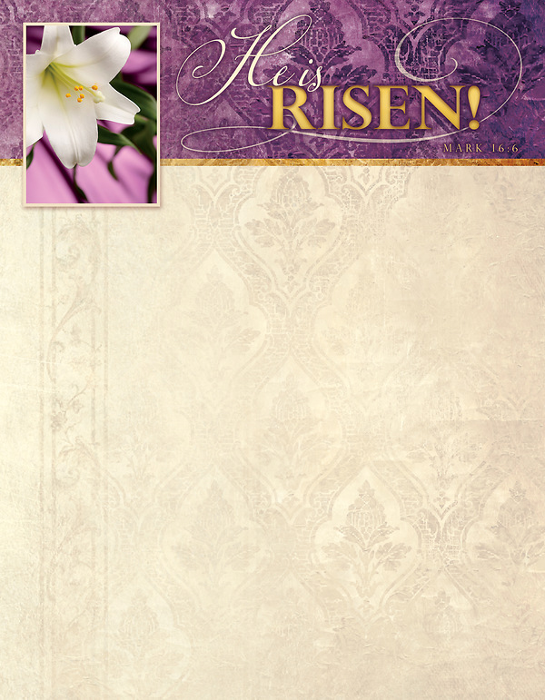 A well-dressed letterhead featuring a lily. Scripture: He is Risen! Mark 16:6. KJV. Size: 8.5" x 11"