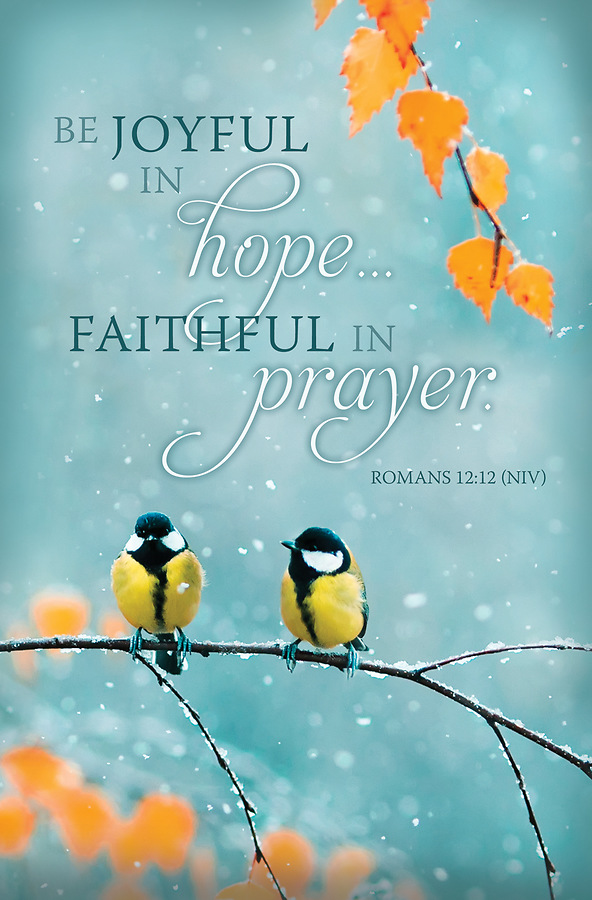 A general regular size bulletin that is used for any worship service featuring beautiful birds sitting on a tree branch while the snow falls. Scripture: "Be joyful in hope faithful in prayer." Romans 12:12. NIV 8.5" x 11" folds to 5.5" x 8.5"