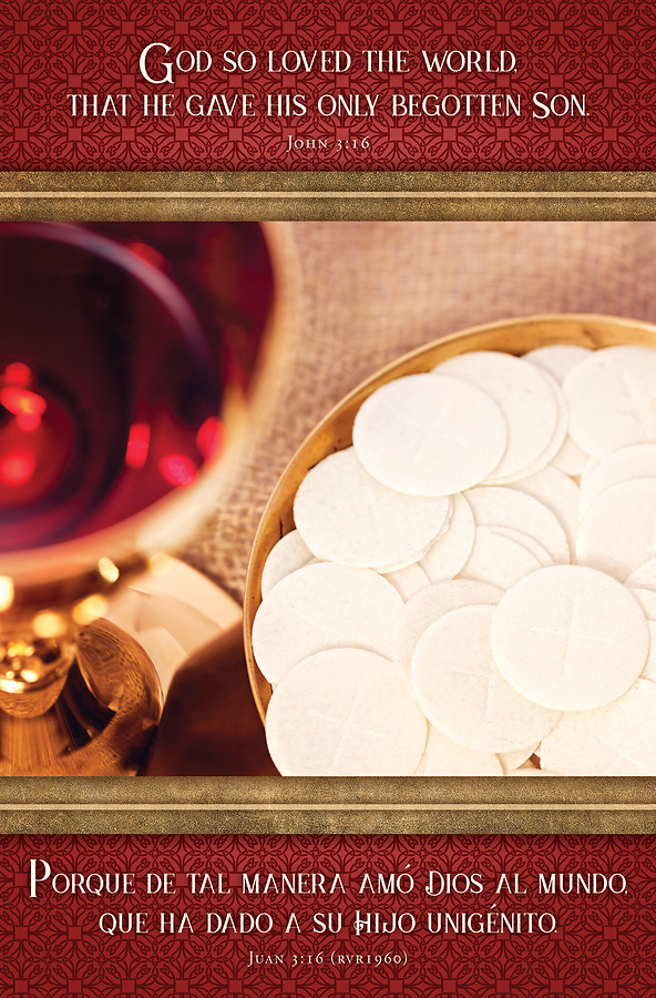 A well-designed communion regular size bulletin featuring a chalice and wafers to represent the body and blood sacrificed for his children. Scripture: “God so loved the world that He gave his only begotten son.” John 3:16 KJV./ Spanish Text: "Porque así amó Dios al mundo, que él dio a su único hijo, para que todo aquel que cree en él no se pierda, sino que tenga vida eterna." Juan 3:16 RVR 1960. Size: 8.5" x 11" folds to 5.5" x 8.5"