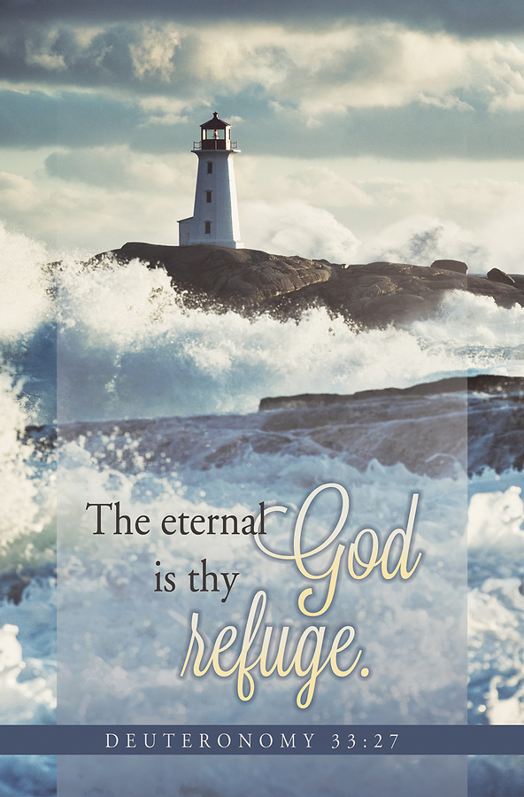 A peaceful funeral regular size bulletin that features a lighthouse on a hill with waves. Scripture: “The eternal is thy God refuge.”Deuteronomy 33:27 KJV. 8.5" x 11" folds to 5.5" x 8.5"