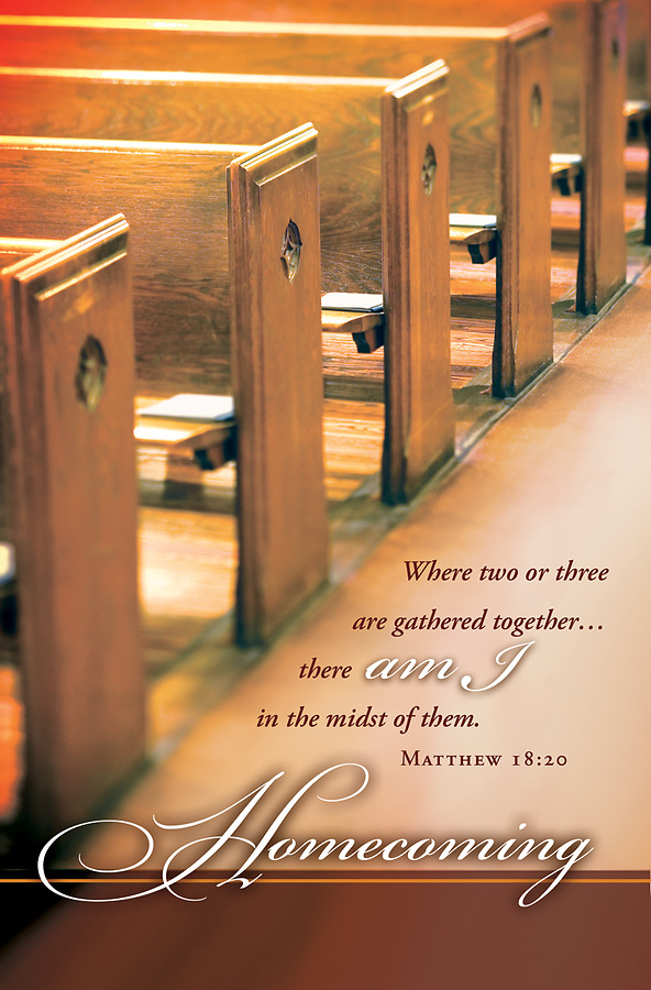 A homecoming regular size bulletin that features an image of wooden pews with an aisle. Scripture: "Matthew 18:20 reads, Where two or three are gathered together...there am I in the midst of them." Matthew 18:20. KJV. Size: 8.5" x 11" folds to 5.5" x 8.5"
