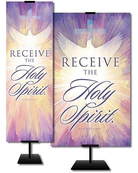 Commemorate the spiritual significance of Confirmation with this beautiful banner. The image features a powerful burst of light in the shape of a dove, a cross near the top, and the words taken from Acts 8:19 (NRSV), which says, Receive the Holy Spirit. Size 3 x 5. Mounts to a T-style banner stand via pole pockets at the top of the banner. Satin Fabric