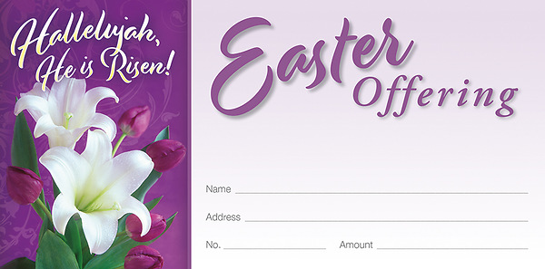 Text: Hallelujah He is Risen! Offering envelope is 3-1/8" x 6-1/4". Sold in packs of 100.