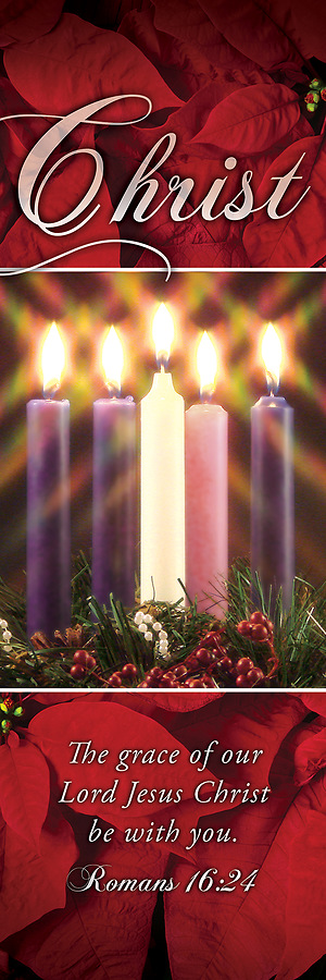 Our Christ Advent Wreath 2' X 6' Fabric Banner is a beautiful and joyful way to celebrate the anticipation of Christ’s birth this Christmas! Featuring Advent candles set on a festive red background of poinsettias, this high-quality contemporary fabric banner is available in two sizes, see all related options below! Celebrate the awe and wonder of Advent with this inspiring reminder of God’s faithfulness and let us come together in joyful expectation found in Jesus Christ! Order early to ensure timely delivery!