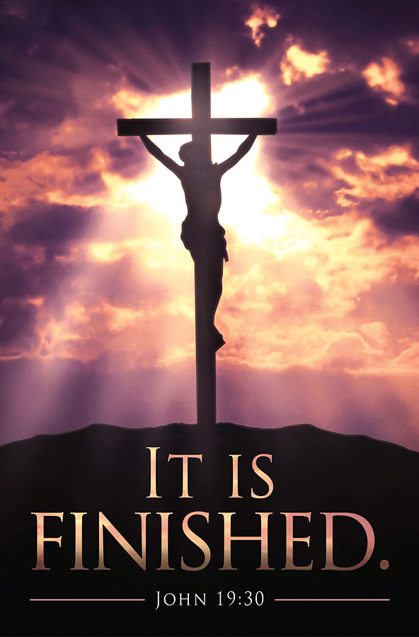 John 19:30 (MSG). Bulletin is 8.5" x 11" unfolded and 5.5" x 8.5" folded. Sold in packs of 100.