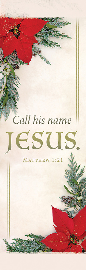 Welcome your congregation this Christmas with the uplifting Call His Name Jesus Christmas Banner 2 x 6 Fabric. Featuring Matthew 1:21 set on a beautiful poinsettia background, it's a festive way to spread Christmas cheer! Whether you're placing it behind the pulpit or displaying it on a wall, this vibrant, high-quality banner will fill the hearts of everyone with an inspiring reminder of our Savior’s birth. Order early to ensure timely delivery! (See all options below)