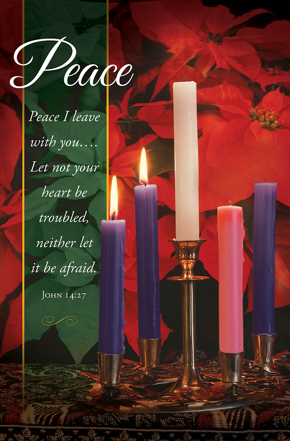 Scripture: John 14:27 (KJV). Bulletin is regular size (8.5" x 11") that folds to 8.5" x 5.5" for presentation.