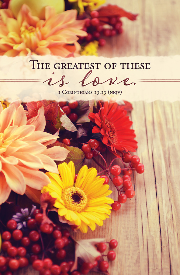 Scripture: 1 Corinthians 13:13 (NKJV). Bulletin is regular size (8.5" x 11") that folds to 8.5" x 5.5" for presentation.