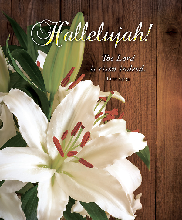 Scripture: Luke 24:34 (KJV). Bulletin is legal size: 8 1/2" X 14" that folds to 8.5" x 7" for presentation.