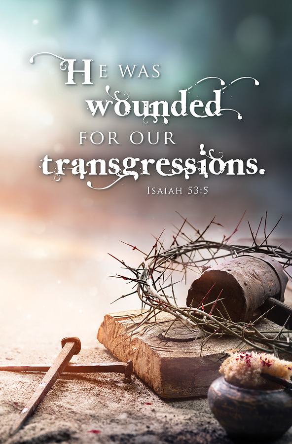 Scripture: Isaiah 53:5 (KJV) Bulletin is regular size 8.5" x 11" that folds to 8.5" x 5.5" for presentation.