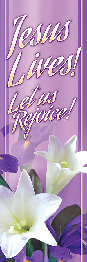 Celebrate the resurrection with this Easter themed banner featuring lilies against a vivid purple backdrop. Text: Jesus Lives! Let Us Rejoice!